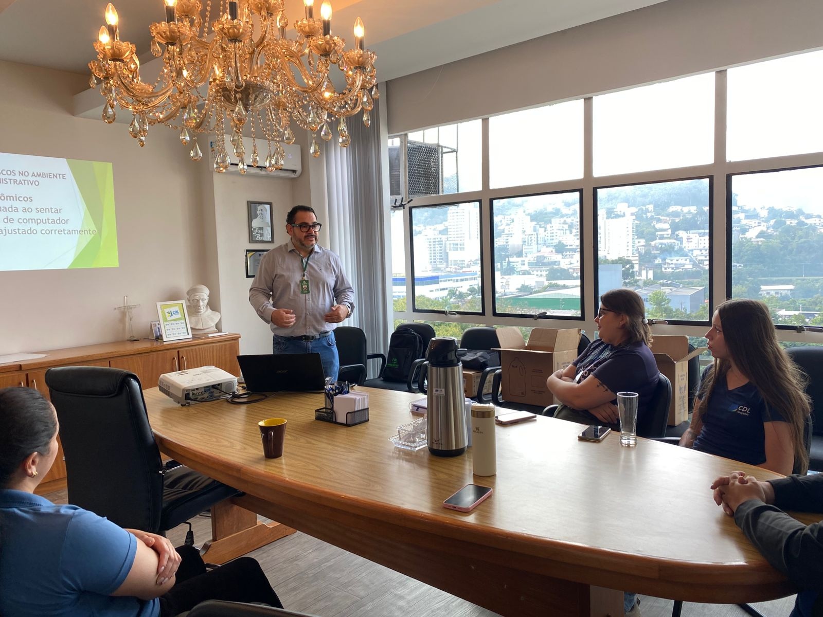 A CDL Joaçaba realizou, nesta semana, uma atividade voltada ao bem-estar das colaboradoras, dentro da programação do mês de abril, dedicado à conscientização sobre saúde e segurança no trabalho.O encontro contou com a participação das colaboradoras da entidade e foi conduzido por Sidnei Padilha, da Portal Med, uma empresa especializada em medicina e segurança no trabalho. Durante a atividade, foram repassadas orientações práticas para ampliar o conhecimento das colaboradoras sobre prevenção de acidentes e cuidados no dia a dia.